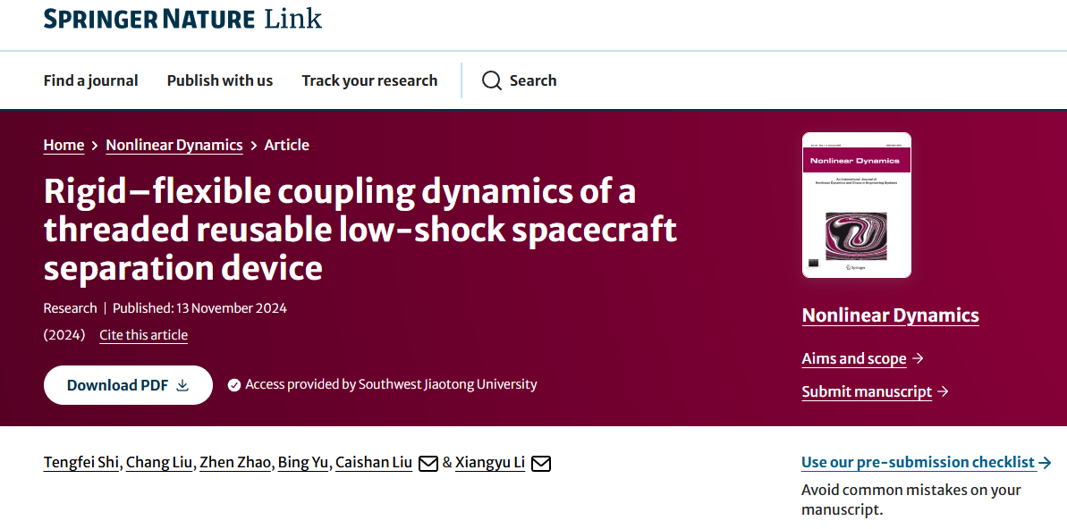 近日,ok138cn太阳集团古天乐李翔宇教授课题组在航天器机构动力学方面取得进展,相关成果以“Rigid-flexible coupling dynamics of a threaded reusable low-shock spacecraft separation device”为题发表在动力学领域期刊《Nonlinear Dynamics》。ok138cn太阳集团古天乐石腾飞博士后为第一作者,ok138cn太阳集团古天乐李翔宇教授和北京大学刘才山教授为共同通讯作者,合作作者包括ok138cn太阳集团古天乐刘畅讲师、北京航空航天大学赵振教授,以及中国运载火箭技术研究院余兵高级工程师。论文详细信息见图1,论文链接:https://link.springer.com/article/10.1007/s11071-024-10591-1