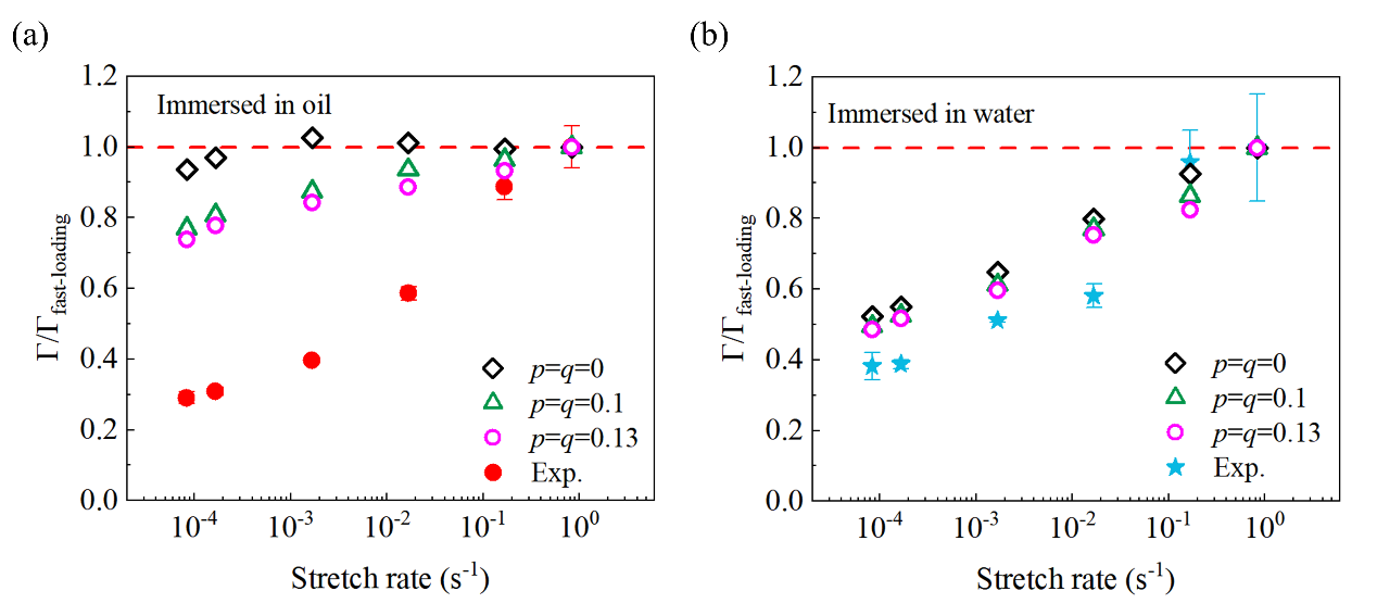 图2. PAAm水凝胶的速率依赖性断裂:(a)油浴;(b)水浴
