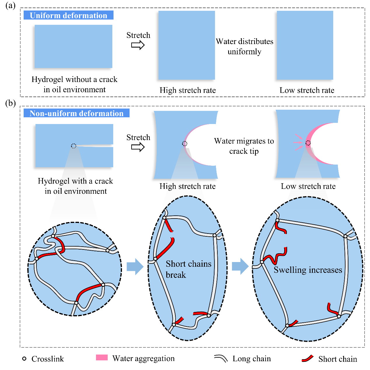 图3. 内部水迁移诱导的水凝胶速率依赖性断裂机制示意图