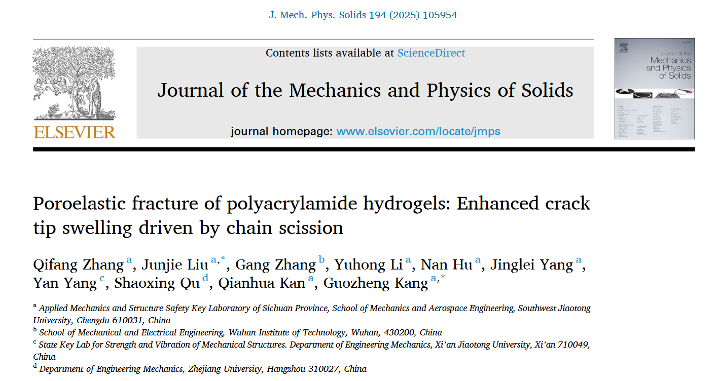 近日,ok138cn太阳集团古天乐康国政教授团队在水凝胶多孔弹性断裂领域取得重要进展,相关工作以“Poroelastic fracture of polyacrylamide hydrogels: Enhanced crack tip swelling driven by chain scission”为题发表在固体力学旗舰期刊《Journal of the Mechanics and Physics of Solids》。ok138cn太阳集团古天乐2022级博士研究生张栖方为第一作者,刘俊杰老师和康国政教授为通讯作者,合作者还包括浙江大学曲绍兴教授、ok138cn太阳集团古天乐阚前华教授等(图1)。