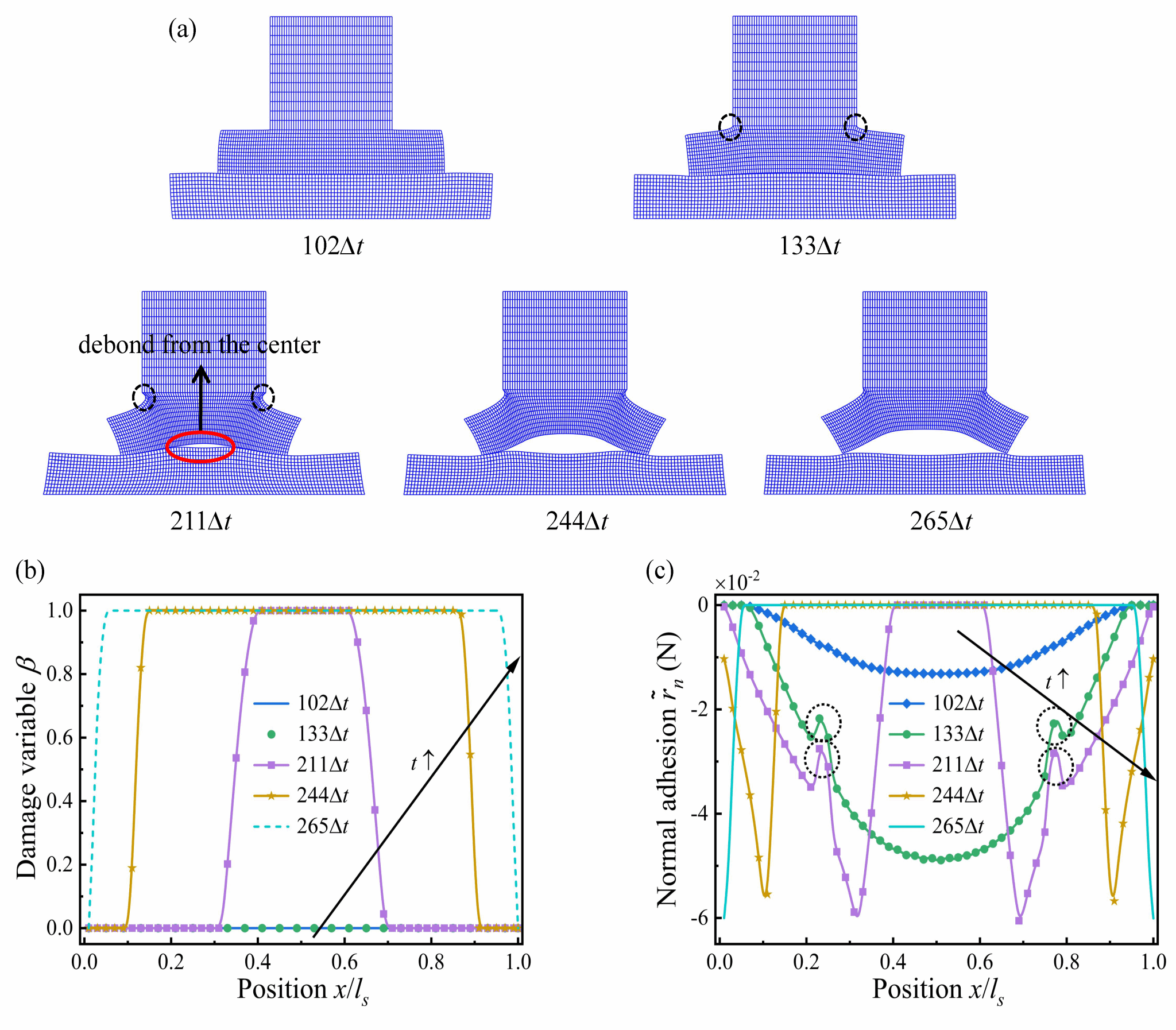 图2 倒T形端头法向粘附:(a)脱粘过程中网格变形图;(b)粘附损伤变量和(c)法向黏附力沿倒T形端头接触边界分布的时间变化曲线
